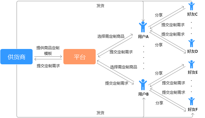2)C2B定制團(tuán)購(gòu)具體模式:針對(duì)某一商品,用戶通過(guò)社交渠道邀請(qǐng)好友,提出個(gè)性化需求,組團(tuán)成功后向商家發(fā)起團(tuán)購(gòu),商家根據(jù)商品需求進(jìn)行生產(chǎn)發(fā)貨。